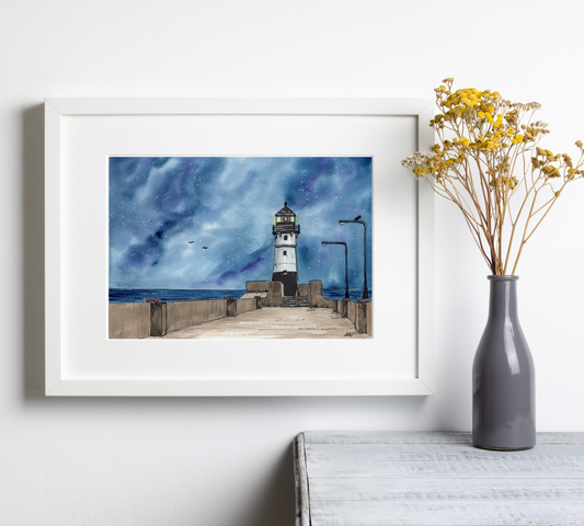 Duluth Lighthouse at Night Pen and Watercolor Art - Archival Quality Art Print