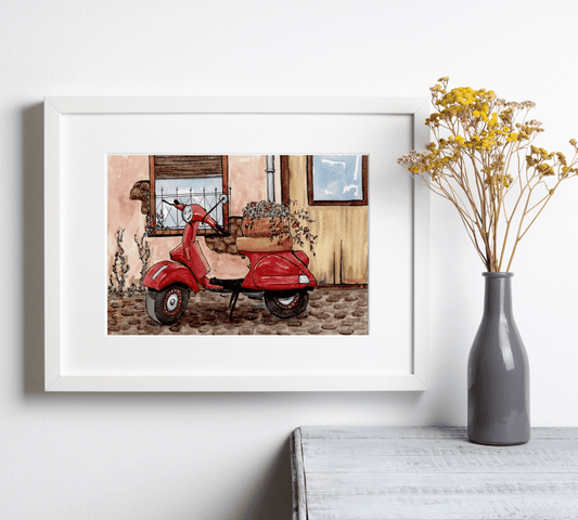 Vespa Scooter Pen and Watercolor Art - Archival Quality Art Print