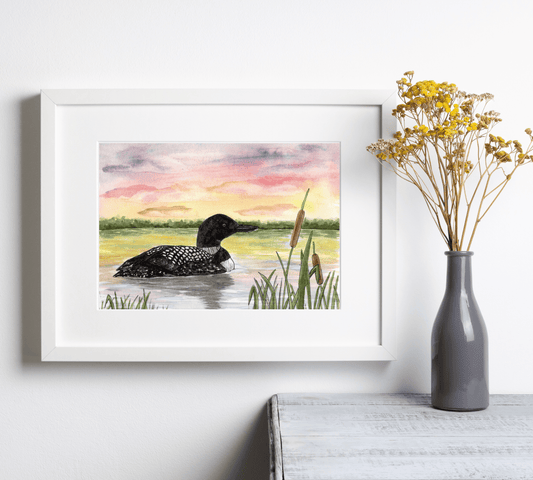 Loon at Sunset - Pen and Watercolor Painting - Archival Quality Art Print