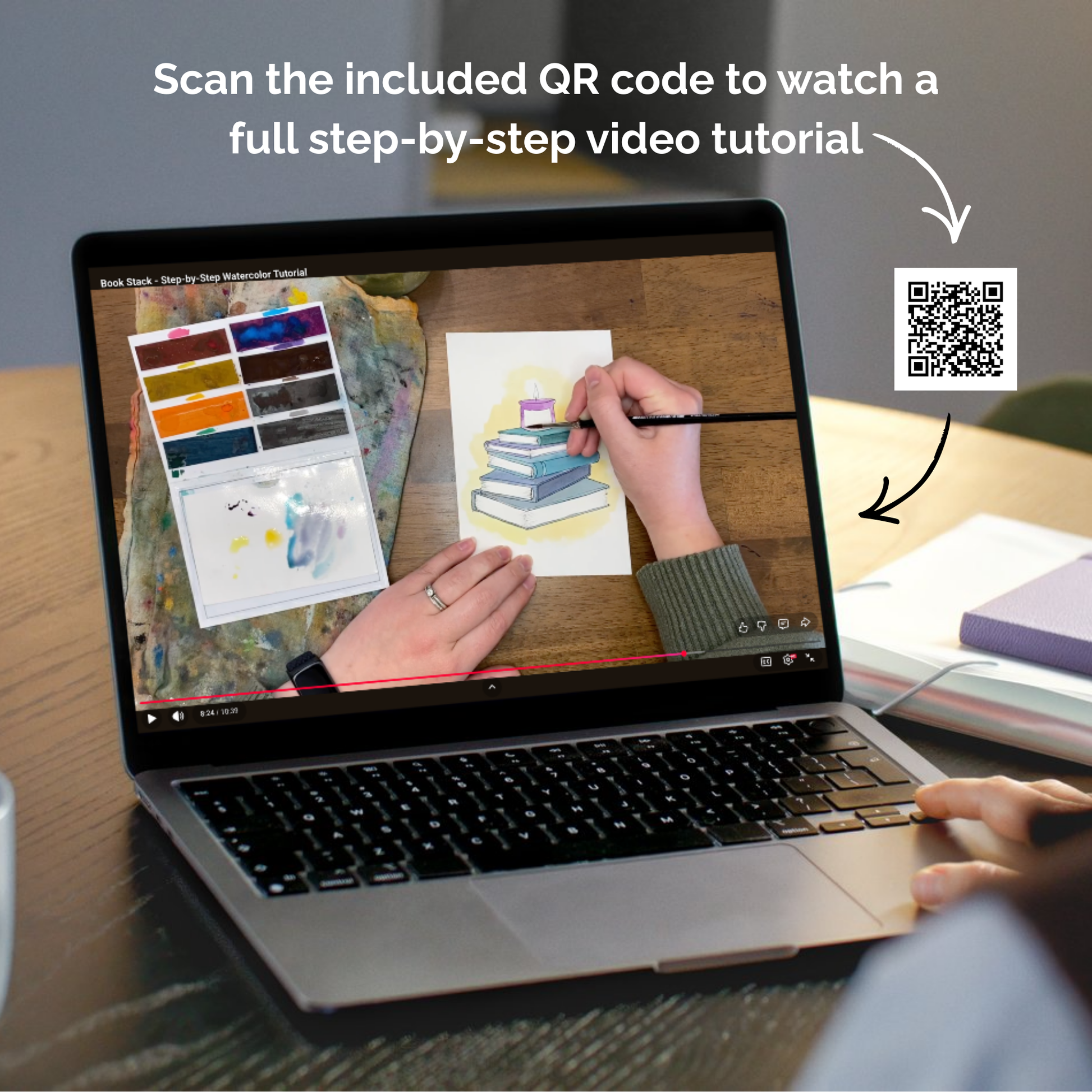 Inside, you’ll find three pre-drawn 5x7” watercolor pages, professional-quality paints, and a brush, along with a QR code to step-by-step video tutorials where I guide you through each project.