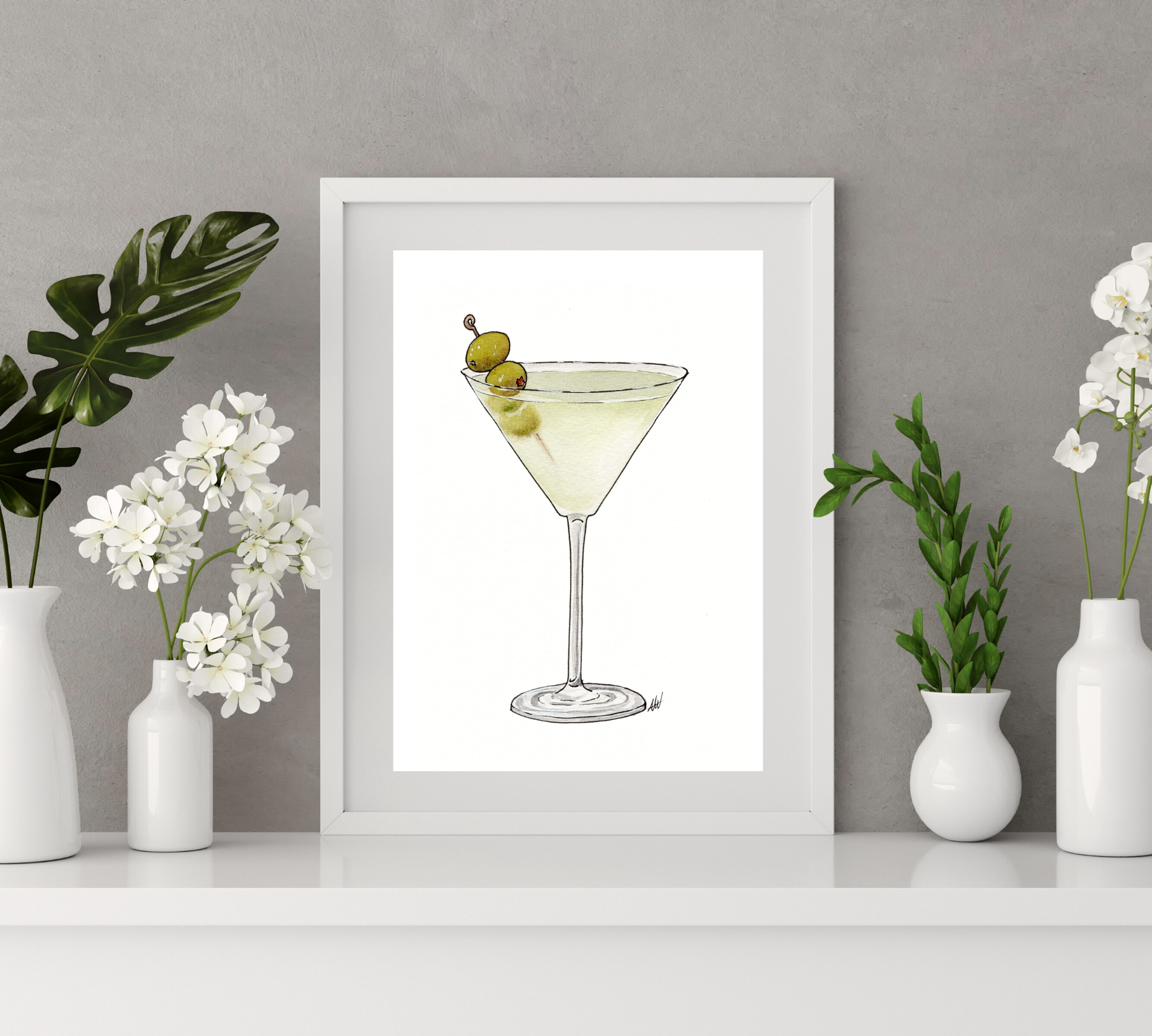 Spice up your home decor with this fine art print of hand-illustrated Martini drink, created with delicate pen and watercolor techniques. This artwork features a luxurious stemmed glass, yellow-green color, and the classic olive garnish. Ideal for decorating your kitchen, dining room, or in-home bar.