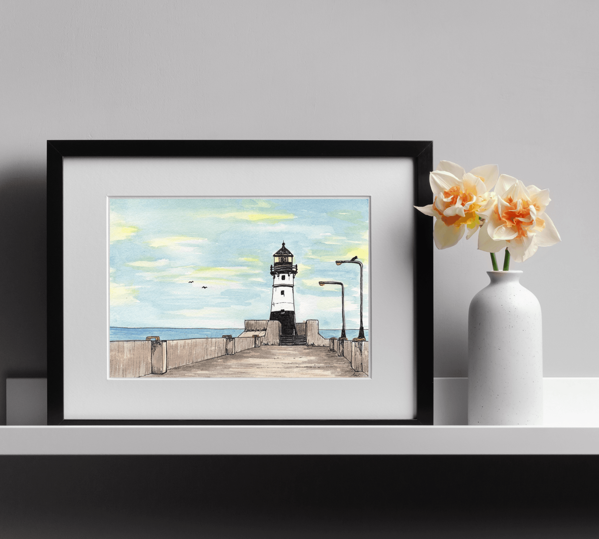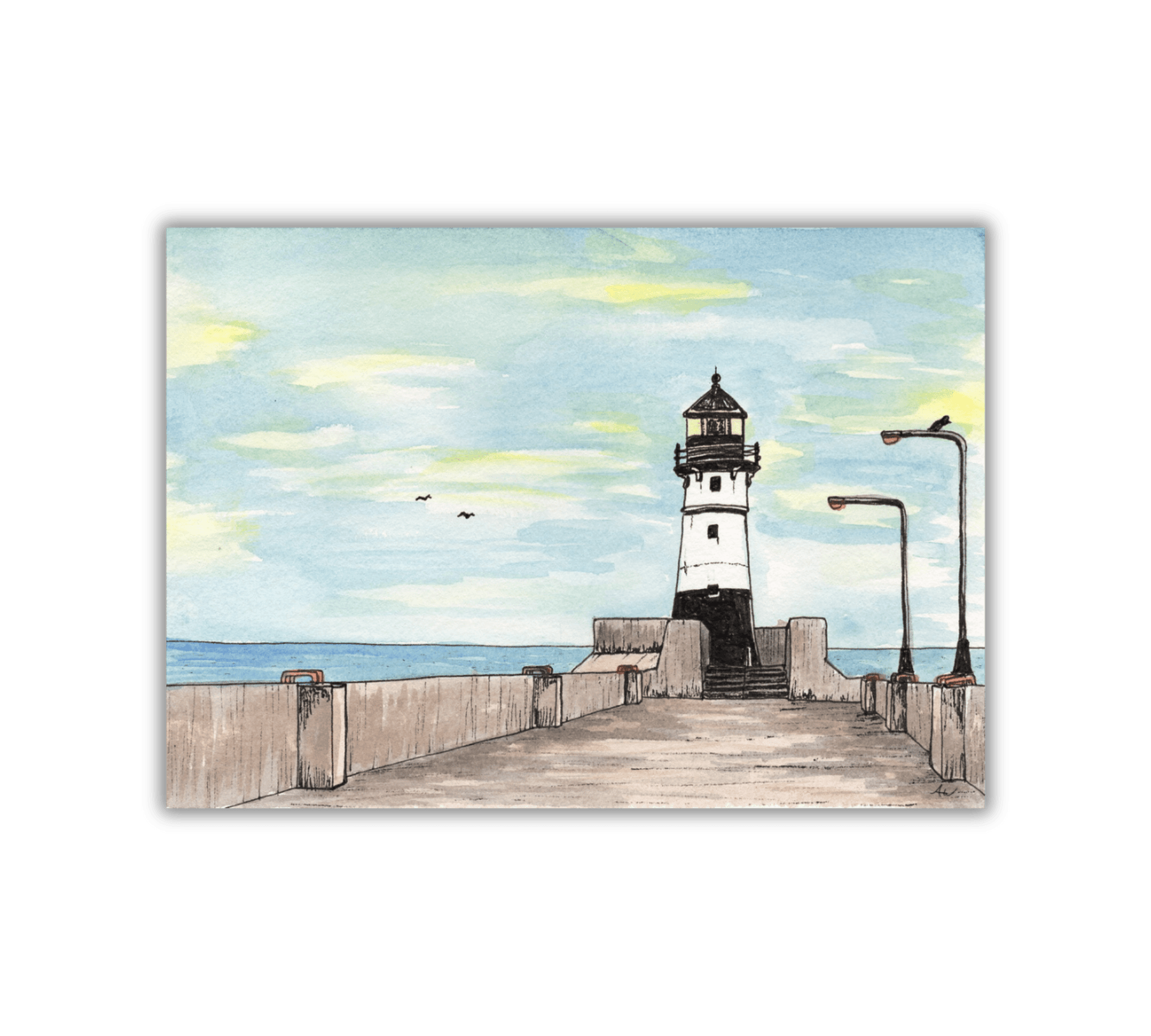Bring the beauty of Minnesota's North Shore into your home with this fine art print inspired by the Duluth Harbor North Pier Lighthouse. This pen and watercolor illustration captures the striking silhouette of this iconic lighthouse standing at the edge of the pier, guiding ships into the Duluth-Superior Harbor on the shores of Lake Superior.