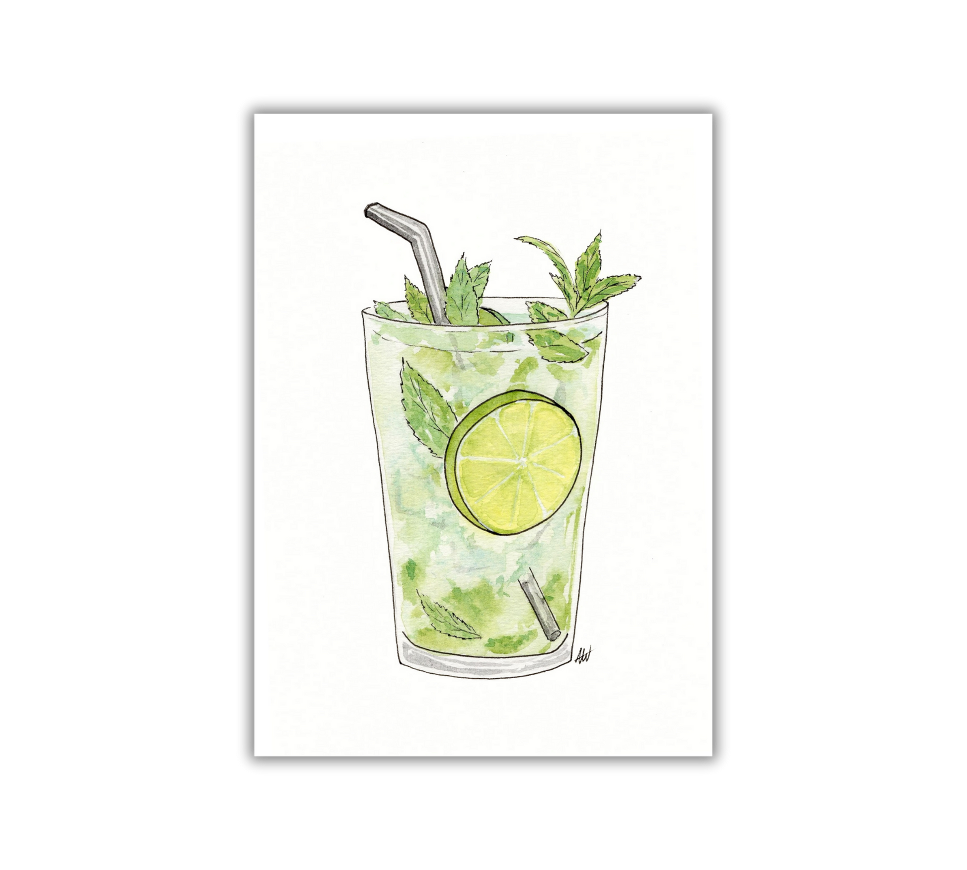 Spice up your home decor with this fine art print of a hand-illustrated Mojito drink, created with delicate pen and watercolor techniques. This artwork features a classy glass, bold orange and red beverage, and a garnish of orange peal and cherry. Ideal for decorating your kitchen, dining room, or in-home bar.