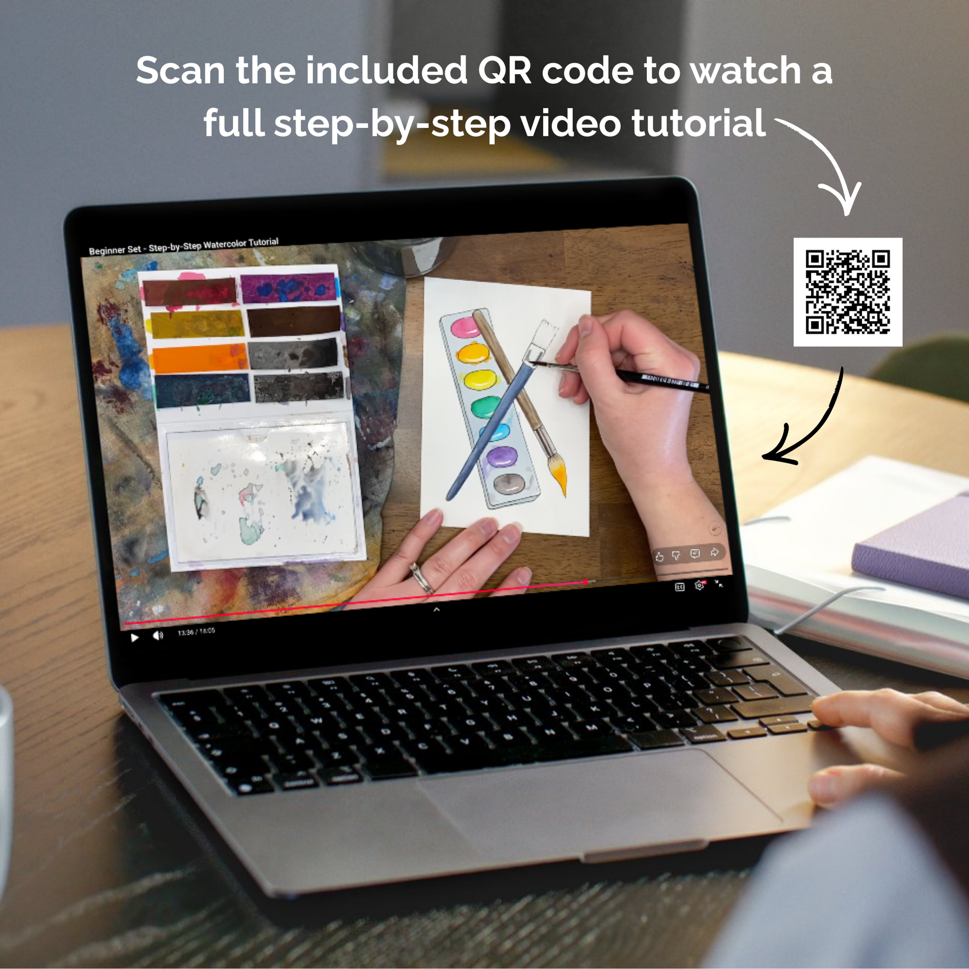 Inside, you’ll find three pre-drawn 5x7” watercolor pages, professional-quality paints, and a brush, along with a QR code to step-by-step video tutorials where I guide you through each project.