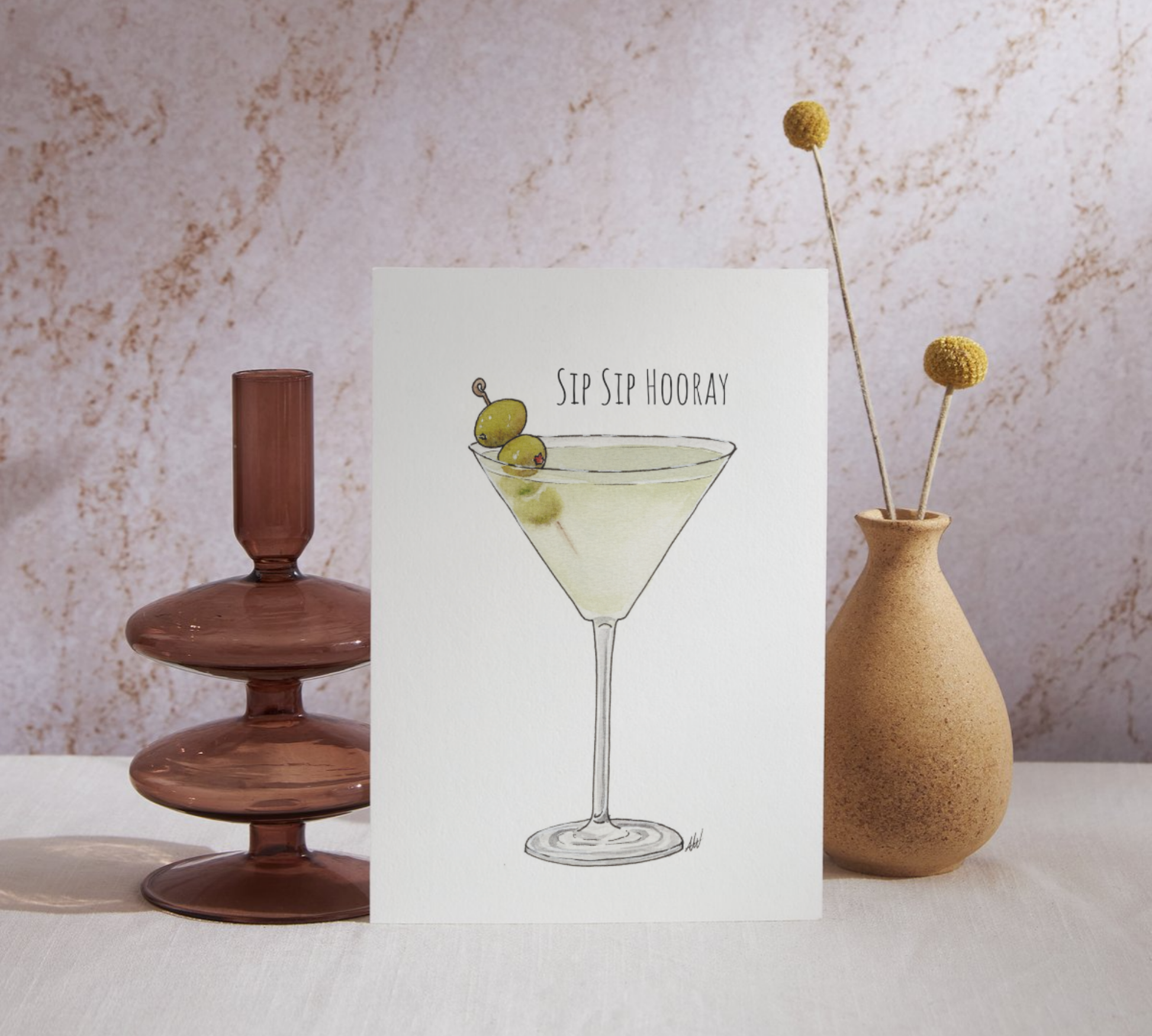 Celebrate your friend or loved one with the classic chant hip hip hooray- except make it drink themed. This greeting card features a hand-drawn, watercolor illustration. This card is perfect for pun enthusiasts and dad joke lovers. It's ideal for anniversary, graduation, wedding celebration, bachelorette/bachelor parties, or just because!