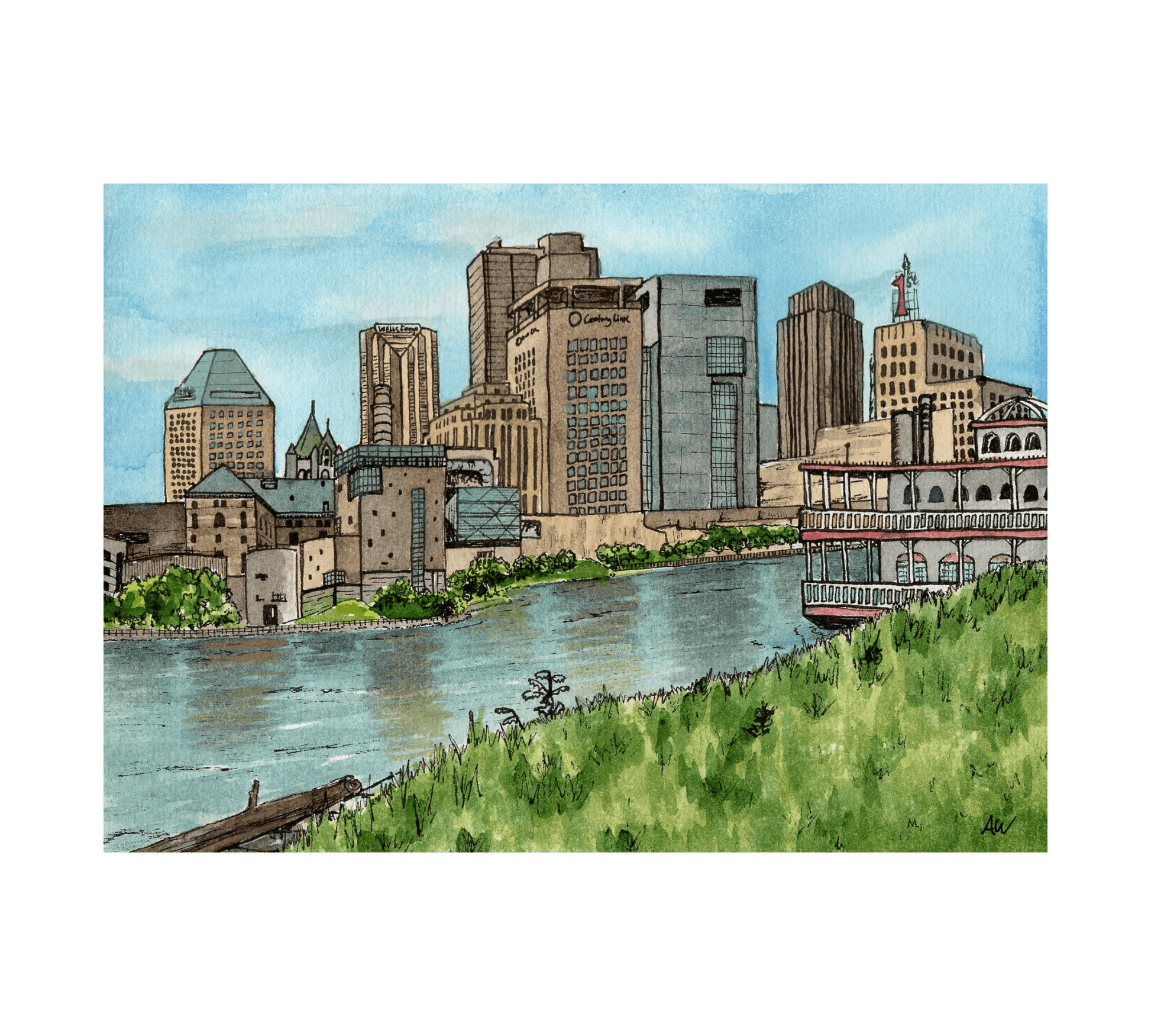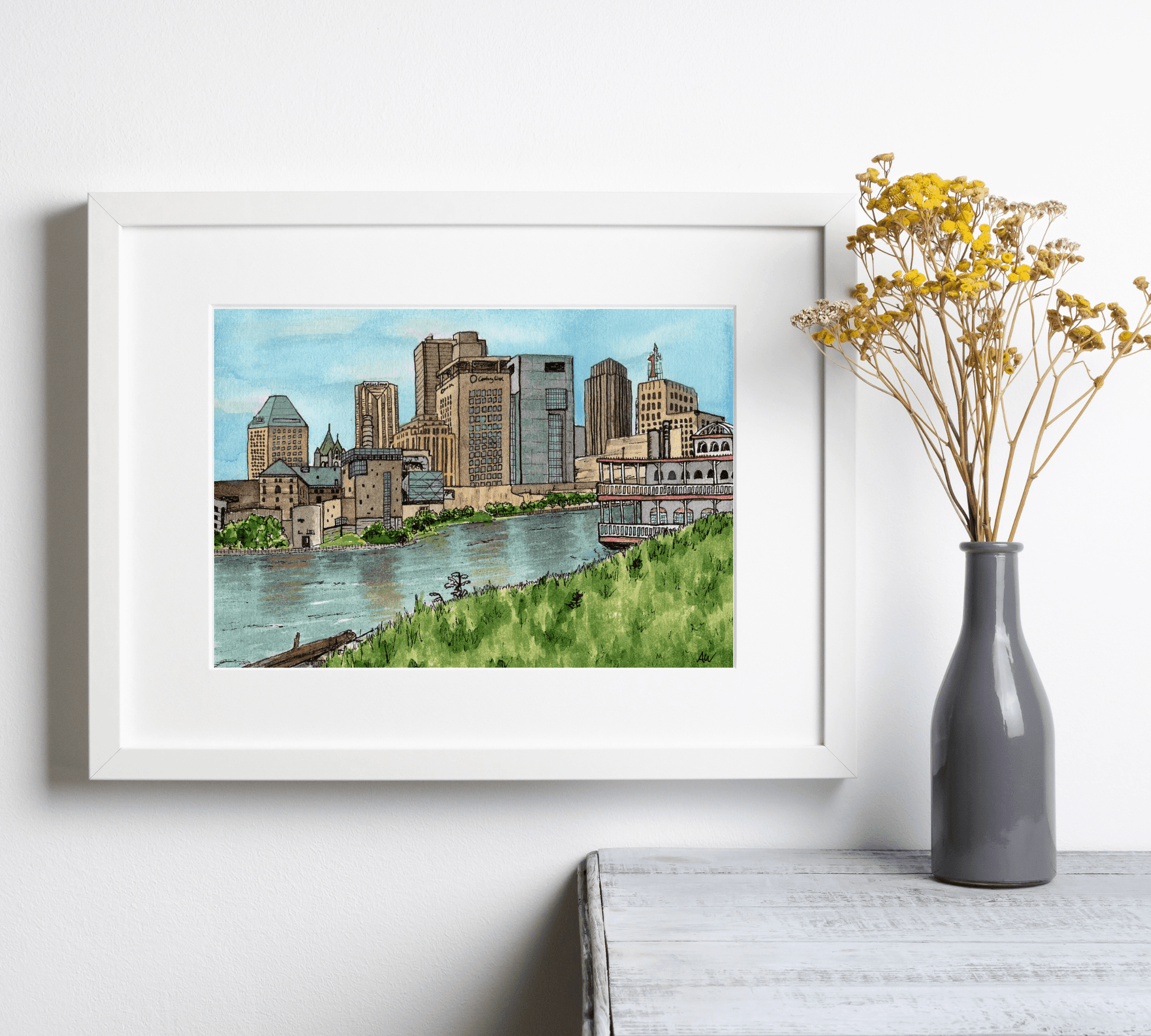 Show your love for Minnesota's capital with this fine art print inspired by the skyline of St. Paul, Minnesota. Featuring a detailed pen and watercolor cityscape illustration, this artwork captures the charm and architectural beauty of St. Paul's most iconic buildings and riverfront views. This St. Paul skyline print is perfect for St. Paul residents, Minnesota art collectors, and skyline enthusiasts.