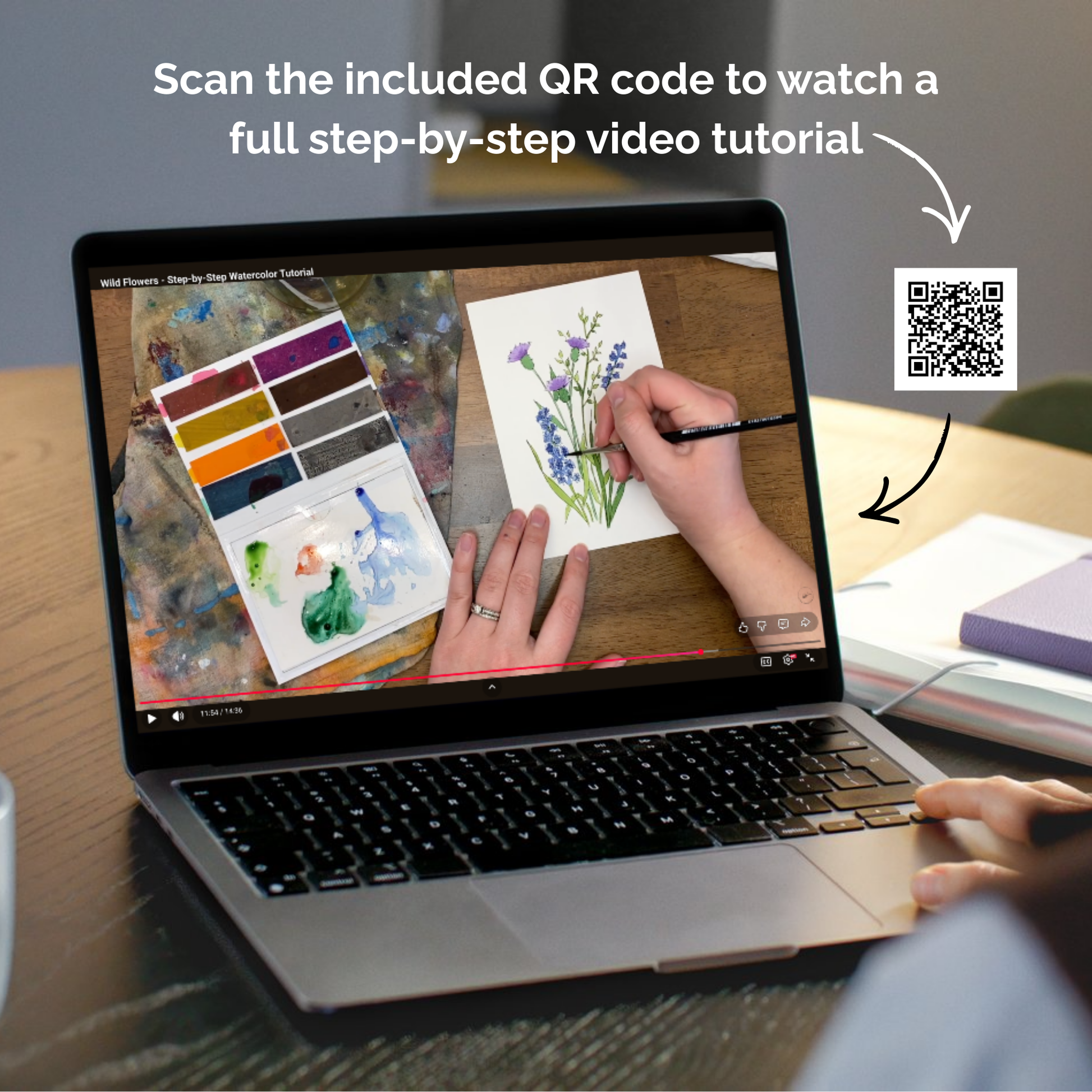 Inside, you’ll find three pre-drawn 5x7” watercolor pages, professional-quality paints, and a brush, along with a QR code to step-by-step video tutorials where I guide you through each project.